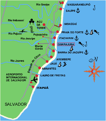 Se llega por la autovía BA 099, denominada Estrada de Coco, en el Km. 42, Municipio de Camacari, Distrito de Monte Gordo, a 50 Km. de Salvador, 12 Km. antes de la famosa Praia do Forte y 35 Km de Costa de Sauípe